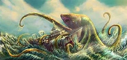 Some recent pyrate movies, (perhaps most notably Pirates of the Caribbean: Dead Man’s Chest), feature encounters with krakens as well. Unlike Clash of the Titans, the visual in Dead Mean’s Chest is spot on: An enormous octupus that is able to envelope entire ships with its tentacles and then tear them apart like butter.