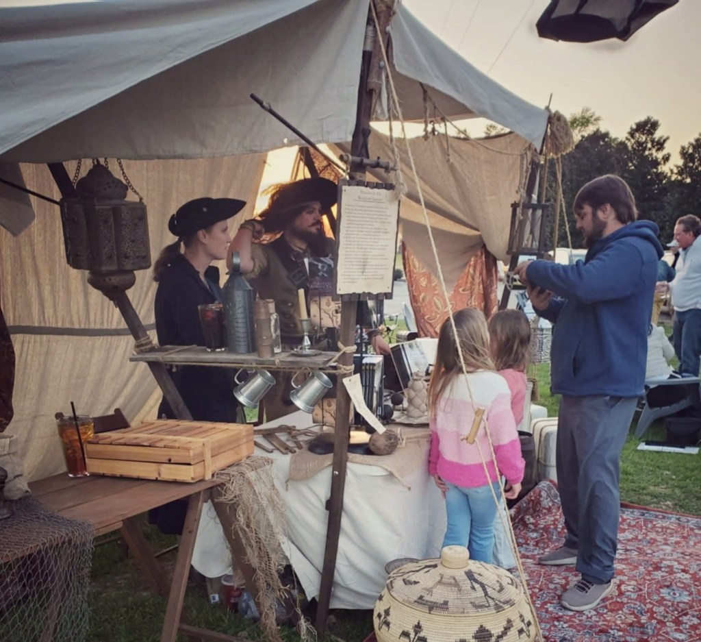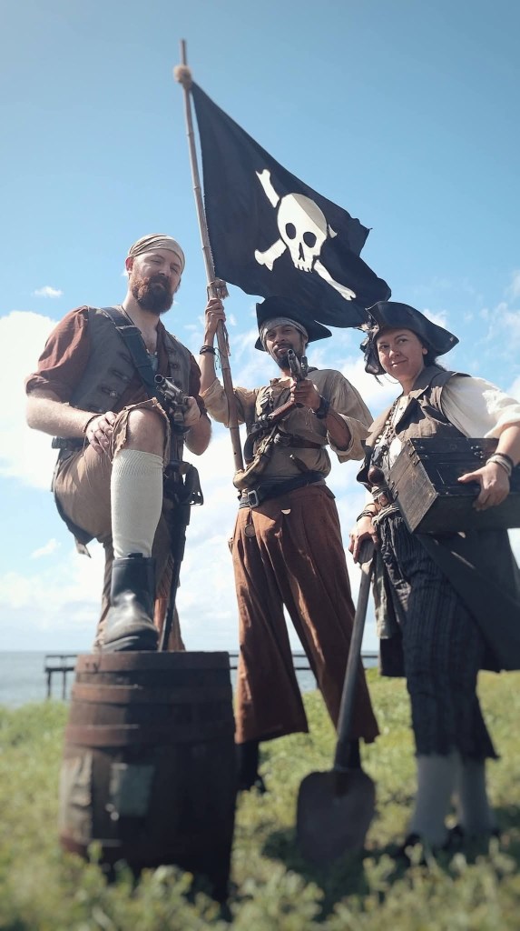 The crew of the Bachelor’s Delight is a pirate reenactment crew based out of Charleston. Founded in early 2025 by pirate author and historian Adam Marrow, his partner Ava Lin Pence, and Jennifer Mincey. The crew stays busy by attending many family-friendly festivals and historic event celebrations throughout the year.